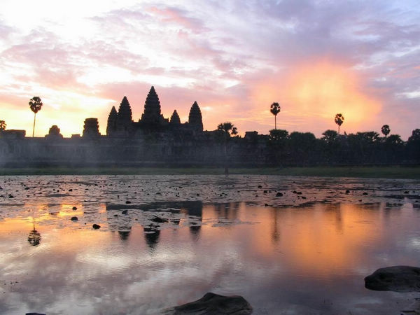 浮雕艺术 吴哥窟的圆雕并不出色。台基上的圆雕神像沉重而呆板,但浮雕却极为精致且富有真实感。在回廊的内壁及廊柱、石墙、基石、窗楣、栏干之上,都有浮雕。内容主要是有关印度教大神毗湿奴的传说,取材于印度史诗《摩诃婆罗多》和《罗摩衍那》及印度教神话《乳海》,也有战争、皇家出行、烹饪、工艺、农业活动等世俗情景,装饰图案则以动植物为主题。其中围绕主殿第1层台基的回廊被称为“浮雕回廊”,长达800米,墙高2米余,壁面满布浮雕。东壁的搅乳海图,北壁的毗湿奴与天魔交战图,西壁的猴神助罗摩作战图等,均描绘神话故事;而南壁西半部的苏利耶跋摩二世骑象出征图则为世俗题材。这些浮雕手法娴熟,场面复杂,人物姿态生动,形象逼真,且已采用重叠的层次来显示深远的空间,堪称世界艺术史中的杰作。从里边向外望,赫然发现,墙上有许多婀娜多姿的人像浮雕,据说是象徵仙女下凡,以千年前的雕刻技术来说,竟然能把仙女刻画得如此活灵活现,而且每一尊的表情、面貌、衣着完全不同,真可说是鬼斧神工之作。这一群手足舞蹈的美丽仙女叫做阿帕莎拉,又被喻为是东方的蒙娜丽莎,相传是由浪花所变成的。宏伟的吴哥窟正因为有了这群俏丽的仙女环绕,而整个鲜活了起来。 除了墙外的仙女引人侧目,走在神庙里,处处可见精美细腻的刻画,有时是在柱子上,有时是在墙角上。有凸出的、也有凹入的,甚至是两者交替的作品也都不难发现。就连走廊上的窗子,也是以小石柱作栅栏,当阳光透过窗子洒入长廊,更融合出一种人文与自然交错的美感。 建筑特点 台基、回廊、蹬道、宝塔构成吴哥寺错综复杂的建筑群。其布局规模宏大,比例匀称、设计简单庄严,细部装饰瑰丽精致。全部建筑用砂石砌成,石块之间无灰浆或其他粘合剂,靠石块表面形状的规整以及本身的重量彼此结合在一起。当时的石工可能不掌握券拱技术,所以吴哥寺没有大的殿堂,石室门道均狭小阴暗,艺术装饰主要集中在建筑外部。 白天和晚上呈现的不同色彩 吴哥窟还有一道奇景,就是在太阳的照耀下,白天和傍晚会呈现不同的色彩,尤其以傍晚的景象最为迷人。整座建筑在阳光的笼罩下,会展现出别样的金碧辉煌,难怪到过这里的人都会称其“摄影者的天堂”。 看吴哥日出日落 距离吴哥窟10分钟的路程,有着吴哥古迹内海拔最高的巴肯山。这里有美丽的日落和日出。每天下午5:00后,无数的游人会蜂拥而至,以至于平时寂静的巴肯山热闹得如同公园般。找一个角落相拥而坐,夕阳映照在天空,散发出落日的余晖打在神秘的热带雨林上,打在吴哥窟突兀耸立的几十座尖塔上,同样也打在两人的脸上,华美得令人感动。 而在小吴哥的护城河边,日出与日落更为暧昧。白色的莲花被朝阳勾勒出金边,露珠晶莹剔透下,倒映着佛塔的倒影;而黄昏的残韵暖暖地照在每一块城砖上,只见身披红衣的僧人萧瑟在夕阳下,整个世界似乎变得分外安宁,人不由自主地虔诚地眺望斜阳。