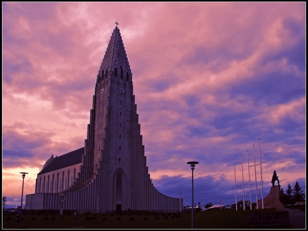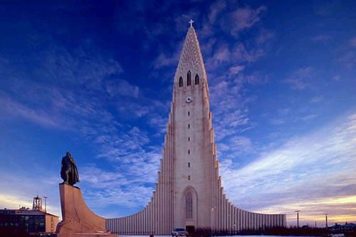 全市最高的建筑,便是著名的哈尔格林姆教堂(Hallgrimskirkja)。这座教堂以冰岛伟大的宗教诗人哈尔格林姆-佩特松(HallgrimurPetursson)命名,由上世纪冰岛最重要的先锋派建筑师GudjonSamuelsson设计,1940年开始奠基,直到60年代末才初步建成,彻底完工更是花了半个世纪。 哈尔格林姆教堂毫无疑问是雷克雅未克最著名的地标建筑,其造型绝对令初见它的人感到震惊。整座教堂几乎是纯白的,令人难以置信地融合了现代派建筑的简洁轮廓和哥特式建筑的繁复线条。教堂两翼以舒展平缓的弧形向中间集中,然后坡度猛然陡峭起来,直到在72米的主塔高处会合于一个精巧的十字架(你可以坐电梯登上制高点,俯瞰雷克雅未克全貌)。据说是冰岛火山爆发后遗留下来的熔岩的形状,给了建筑师创作的灵感;同时,教堂两翼多褶的外立面,又让人想起教堂里最重要的乐器——管风琴。 然而,这座教堂不仅因其标新立异的外形而被评为全世界最壮美的十座大教堂之一,而且其内部结构也令人叹为观止——30多米高、可容纳1200人的主厅顶部,层层叠叠地密布着线条优美的尖拱,这些纯白的尖拱毫无疑问会催生信徒们对纯洁天堂的急切向往;很可能由于这些尖拱所产生的反射与共振,使得这座教堂的音响效果令人称绝,再加上它拥有的声音洪亮优美的大型管风琴,许多唱片公司特意选择这个大厅来录制宗教性较强的古典音乐“发烧碟”。 后来漫步雷克雅未克街头的时候,才发现不仅哈尔格林姆教堂,其他大大小小外形各异的教堂,基本上也都是纯白的,看来在这个冰雪环抱的地方,“纯白”正是最纯粹、最能象征冰岛人宗教性格的“民族风”。