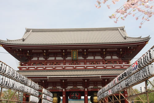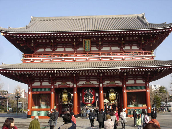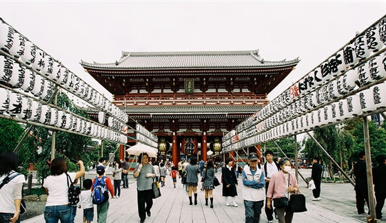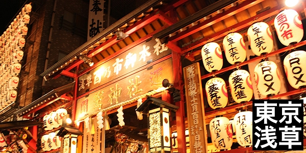 浅草的中心地带是在1873年经过区域规划整理后被称为六区的区域。浅草六区过去曾是剧场和舞台纷繁林立,作为艺人的聚集地呈现出一片盛况。昭和初期甚至发展到大有胜过当今新宿和涩谷的气势,许多明星艺人就是从这里走向全国的。 现在的浅草虽然已经没有了往日娱乐街的辉煌,但不少电影院和曲艺场依然健在。 作为江户文化象征的浅草一带同时也是可以大朵快颐品尝美食的绝佳场所。不仅可以享受到像天妇罗,荞麦面,鸡素烧,鳗鱼,泥鳅等具有代表性的江户食物,善哉饼,甘薯羊羹,丸子,樱花饼,以及糯米糖,煎豆,酥饼等日式小零食也会带给你不少乐趣。 浅草寺 在地下铁浅草站下车后走不了多远,就能看到耸立在浅草寺入口处的大门-雷门。挂在门口的巨大灯笼显示出一种威严庄重的气势。进了雷门顺着通往庙宇的道路上,有一条长约250米的商店街。漆成红色带有江户风情的小店排列在道路两旁,前来参拜寺庙和购买礼物的游客来来往往热闹非凡。 走过商店街进入到寺院里面就能看到浅草寺的正殿和五重塔。江户时代德川家康将这里指定为幕府的祈愿地,浅草因此也就成为了老街文化的中心。浅草寺是东京都内最古的寺庙,也是浅草这片区域的象征。另外,在浅草寺正殿附近有一座据称是建于平安时代后期至镰仓时代的浅草神社。 说到浅草就不能不提到起源于江户时期的祭祀庆典。作为江户三大祭典之一的三社祭,是于每年5月举行的浅草神社的祭祀活动。庆典中登场的神轿威武壮观,充分体现出江户时代的人文风情,让观看的人不由得兴致昂然随之热血沸腾起来。7月9日和10日,400家以上的商家汇集于浅草寺内,在这里举办酸浆球集市(酸浆球:一种类似酸浆果的玩具)。12月17~19日,则是以迎新年购正月用品为起源的著名的特产集市・毽子板集市(毽子板:一种貌似羽毛球拍但形状较小的日本式玩具)。江户末期贴有歌舞伎演员肖像画的毽子板风靡一时,毽子板成为集市主角的习俗也就流传到今天。