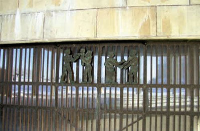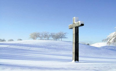 他们说,一定要自己去一趟墓园里的教堂,才能体会葬礼结束走出教堂回返大自然天地的那份从容与快意。一个下雪的隆冬,我去了。 墓园在斯德哥尔摩的市郊。一下地铁站出口的鲜花店,也是许多年前阿斯普伦想的,花店铺子就在附近,可也要够远一些,不让那些乱乱的铺子妨碍他做自然公园的一进门的美观。 教堂的入口,我又领略了阿斯普伦独有的那种戏剧性。那是一道横的铁栏柱子的拉门。雪地与教堂隔着这道铁铸门,铸镶一个图像家庭的一对男女抱起初生的婴孩,高高举起。有死就有生。 那时斯特劳导演已经发现了铁栏杆的内层阿斯普伦50年前使用的玻璃升降拉门,铁门是横拉的,但这层玻璃门则是上下升降,当年制作的工厂竟然还在,而且竟然把它修好了,一时间震动了首都的文化界,人人来看教堂的玻璃升降门,人们突然重新想象上个世纪的上半叶,这个建筑家使用这么奇特而安逸的方式,来面对葬礼。